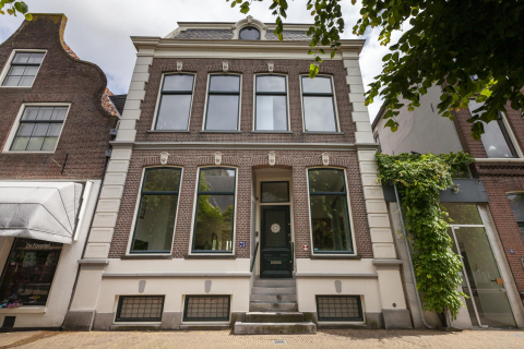1e verdieping: overloop met schuifkast, slaapkamer voorzijde, badkamer (wit/antraciet betegeld) met ligbad, wastafel met meubel, hangend toilet, wasmachineaansluiting en raam. Twee slaapkamers aan de achterzijde, beide met hoog plafond.